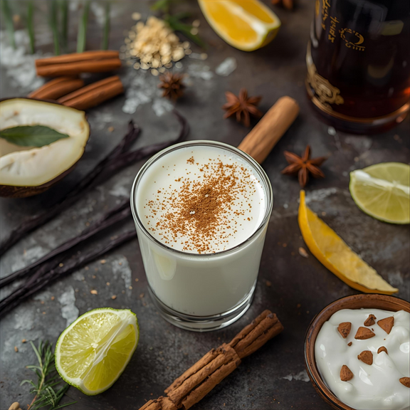 Smells like a velvety glass of homemade Kremas shared in a cozy kitchen—sweet coconut cream swirling with rum, cinnamon, clove, and nutmeg.